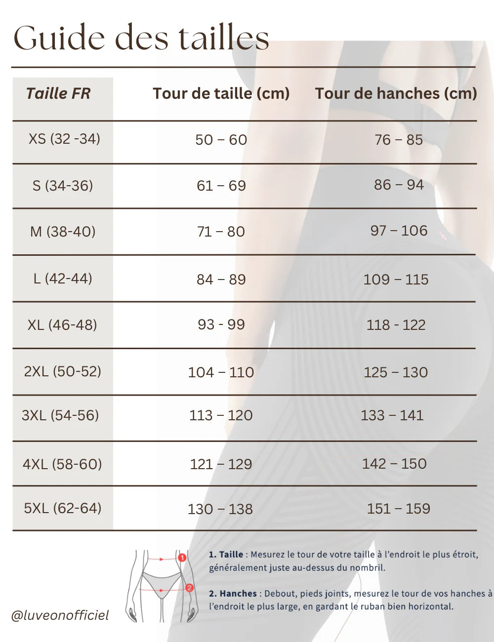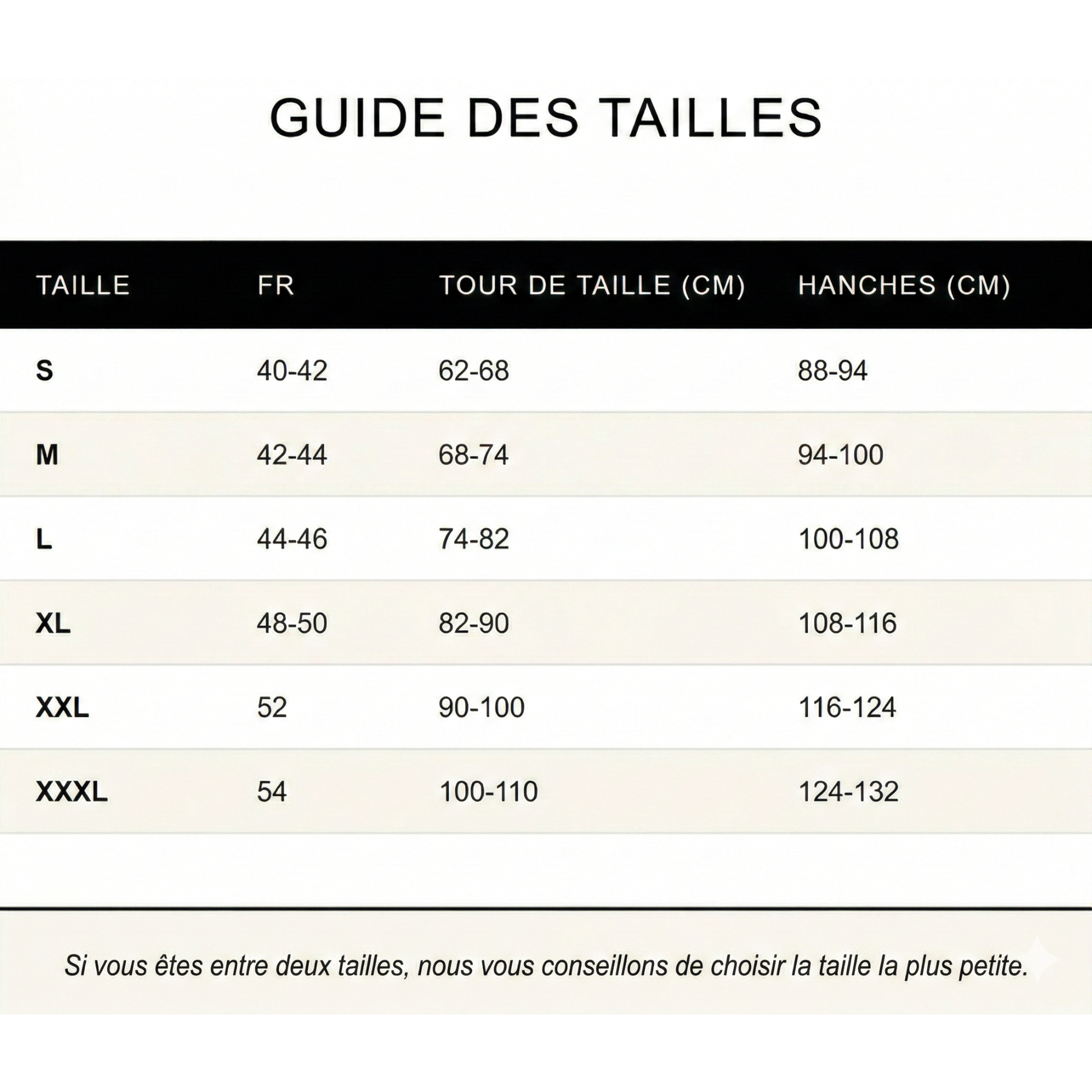 Si vous hésitez entre deux tailles, choisissez la taille du dessus pour plus de confort.